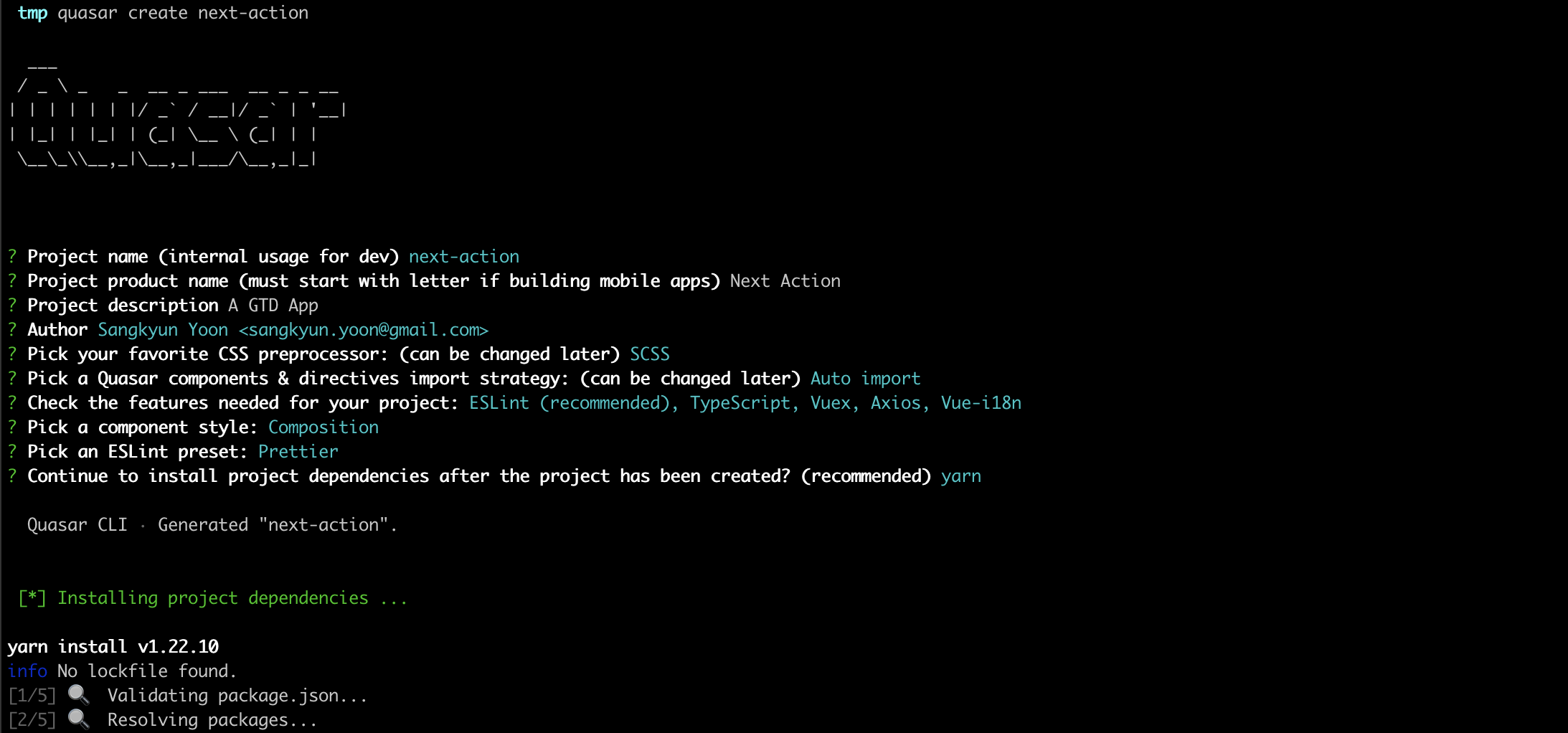 그러면 다음과 같은 화면이 나오는데요. vue cli와 비슷합니다. 프로젝트이름, 제품이름, 제품설명, 프로젝트 생성자, css 스타일, Quasar components 자동 import여부, Quasar에서 사용할 부가적 라이브러리 의존성 추가, eslint 사용여부, cordova등을 이용해 앱설치 필요한 패키지 이름 설정, npm 설치도구순으로 물어보고 이설정을 완료하고 설치를 시작합니다.
