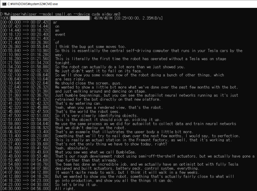 whisper --task transcribe sample.mp3 whisper --task translate sample.mp3이제 응용을 해서 실제로 사용해 보겠습니다.